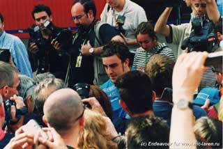 Перед боксами Рено было форменное столпотворение, так как местная публика ждала своего земляка - Алонсо (нужно ли говорить что в дни ГП он упоминался на всех каналах тв), и когда он показался, то началось форменное безумие. Что бы сфотографировать его (и просто что ни будь увидеть), мне пришлось совершить акробатический трюк - встать на узкий ограничительный барьер, одной рукой держаться за крышу "капитанского мостика", а другой держать фотоаппарат…